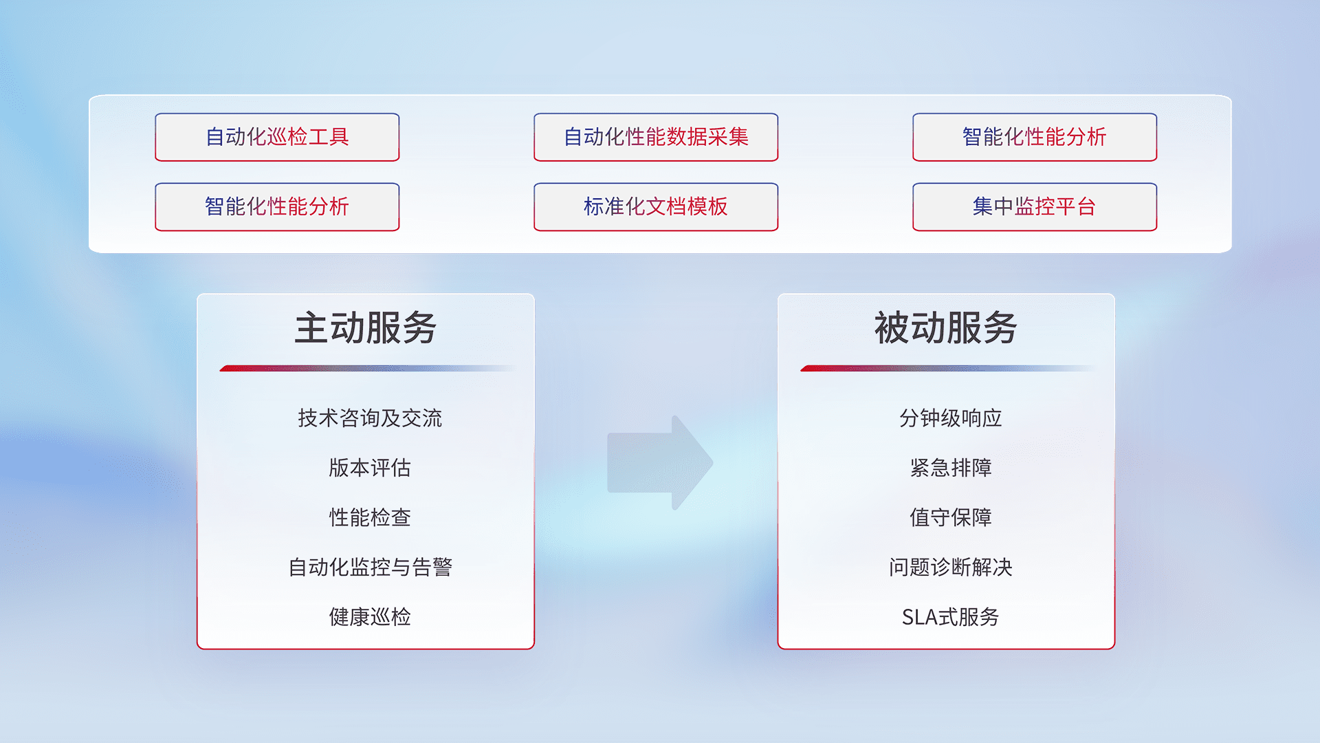 智能化工具和标准化文档,,,保障服务质量,,提供主动服务(包含技术咨询、、、、版本评估、、性能检查、、、自动化监控与告警、、、、健康巡检)和被动服务包含(分钟级响应、、、紧急排障、、值守保障、、、问题诊断解决、、、SLA服务)。。